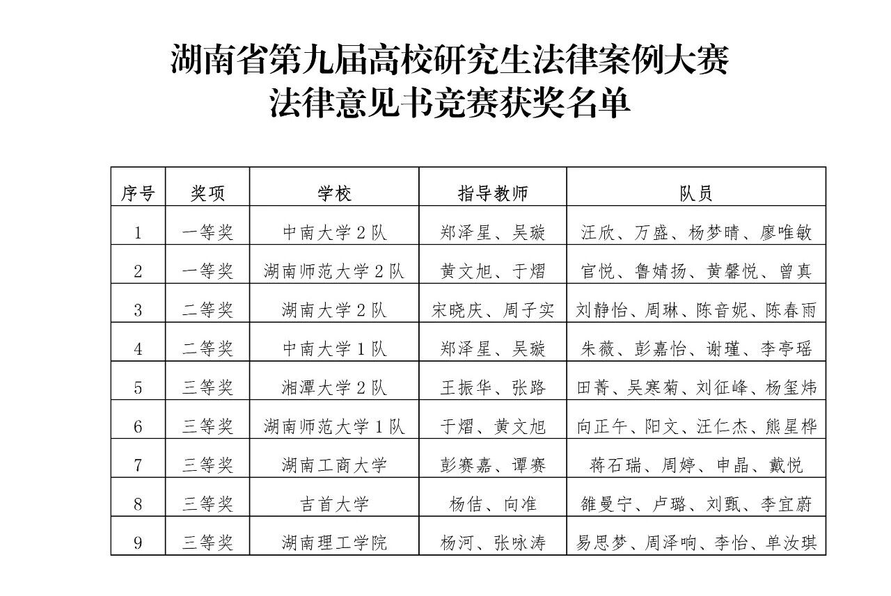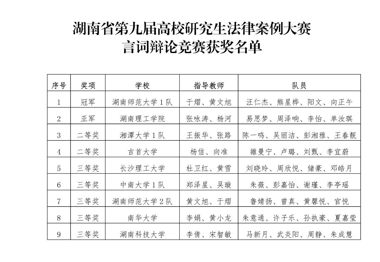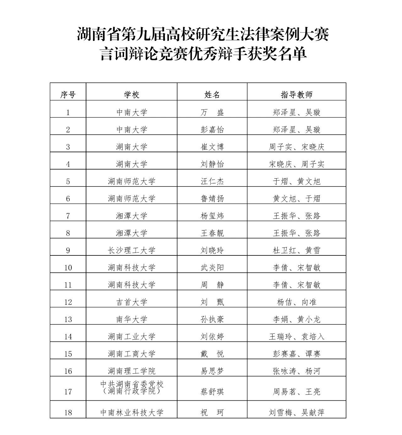 本网讯(通讯员:向芃、严茜)11月15-16日,由湖南省教育厅主办、湖南师范大学承办的湖南省第九届高校研究生法律案例大赛圆满落幕。省内中南大学、湖南大学、湖南师范大学、湘潭大学等13所开设法学(法律)专业硕士点高校的17支队伍参赛(含湖南省委党校,其中中南大学等4所规模较大的高校各有2支队伍参赛),比赛分为“法律意见书竞赛”和“言词辩论竞赛”两个阶段。其中,我们研究生代表队凭借扎实的专业素养和出色的发挥,在言词辩论竞赛中斩获二等奖,并在法律意见书竞赛中荣获三等奖。团队刘甄同学荣获“优秀辩手”个人称号,充分展现了bv1946官网法学研究生的综合实力。获奖名单如下: